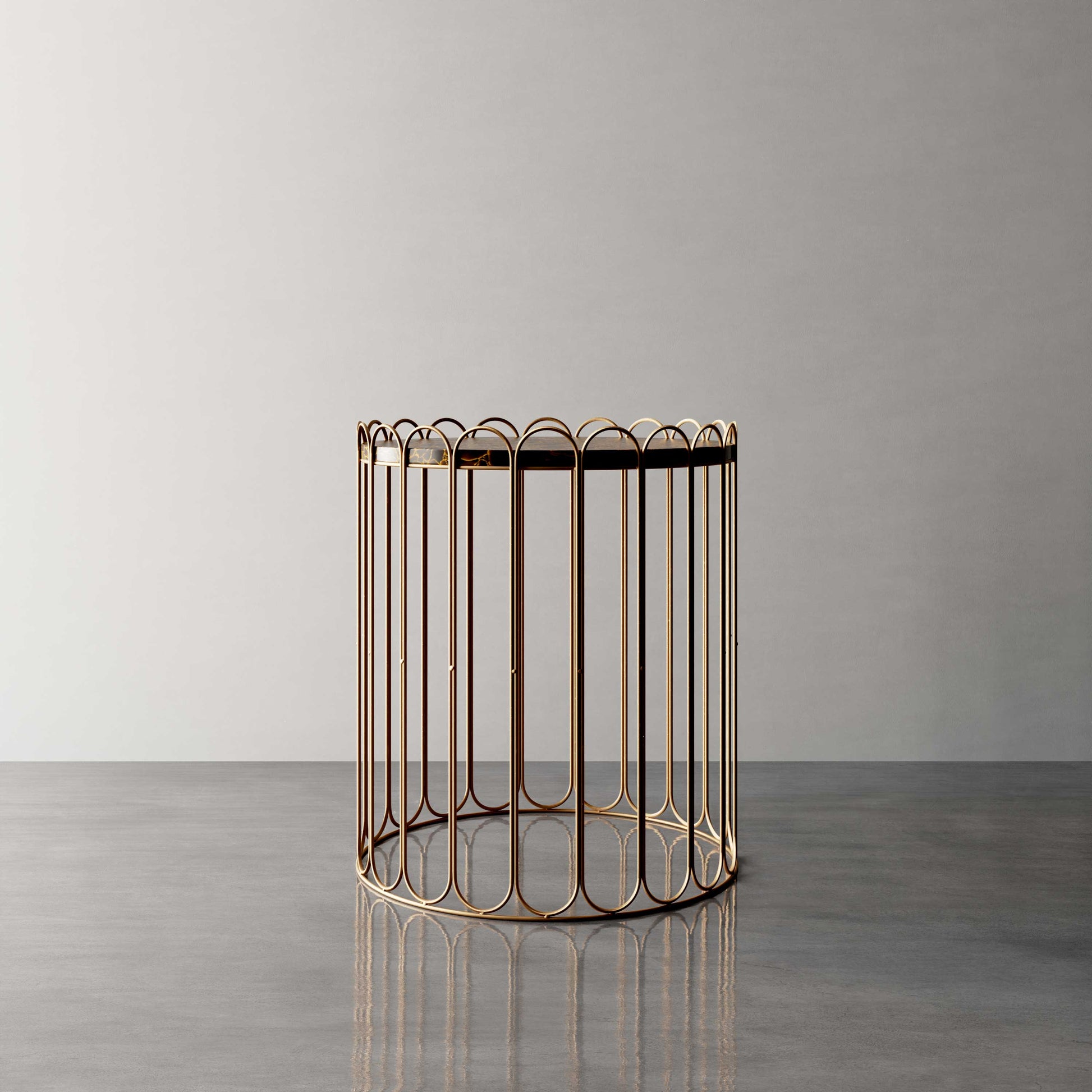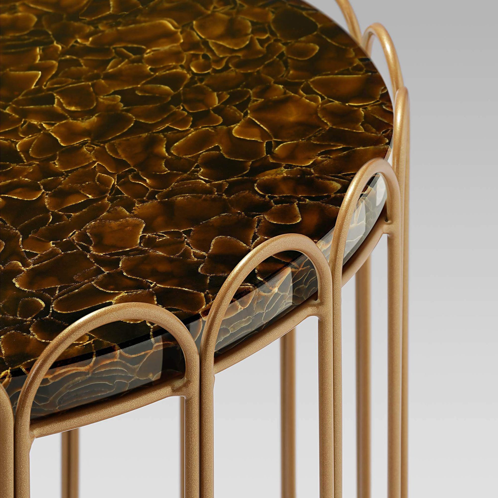 Unser Modell "London" ist ein Beistelltisch mit goldfarbenem Gestell aus recyceltem Metall und der besonderen MAGNA Glaskeramik. Das Modell spiegelt die in der englischen Hauptstadt durchwachsenen Stile und kulturellen Einflüsse wider. Ob man durch die Portobello Road in Notting Hill wandelt oder die prächtigen gotischen Elemente in der Westminster Abbey bewundert - der Prunk und die zeitlose Eleganz dieser Stadt sind in diesen Tisch eingeflossen. Die halbrunden Kurven des Gestells sind inspiriert an den typisch georgianischen Reihenhäusern der Stadt. Die changierende Glaskeramik erinnert uns an das Licht des Sonnenuntergangs, das durch die bleiernen Fenster der zahlreichen Kirchen und Kathedralen fällt.