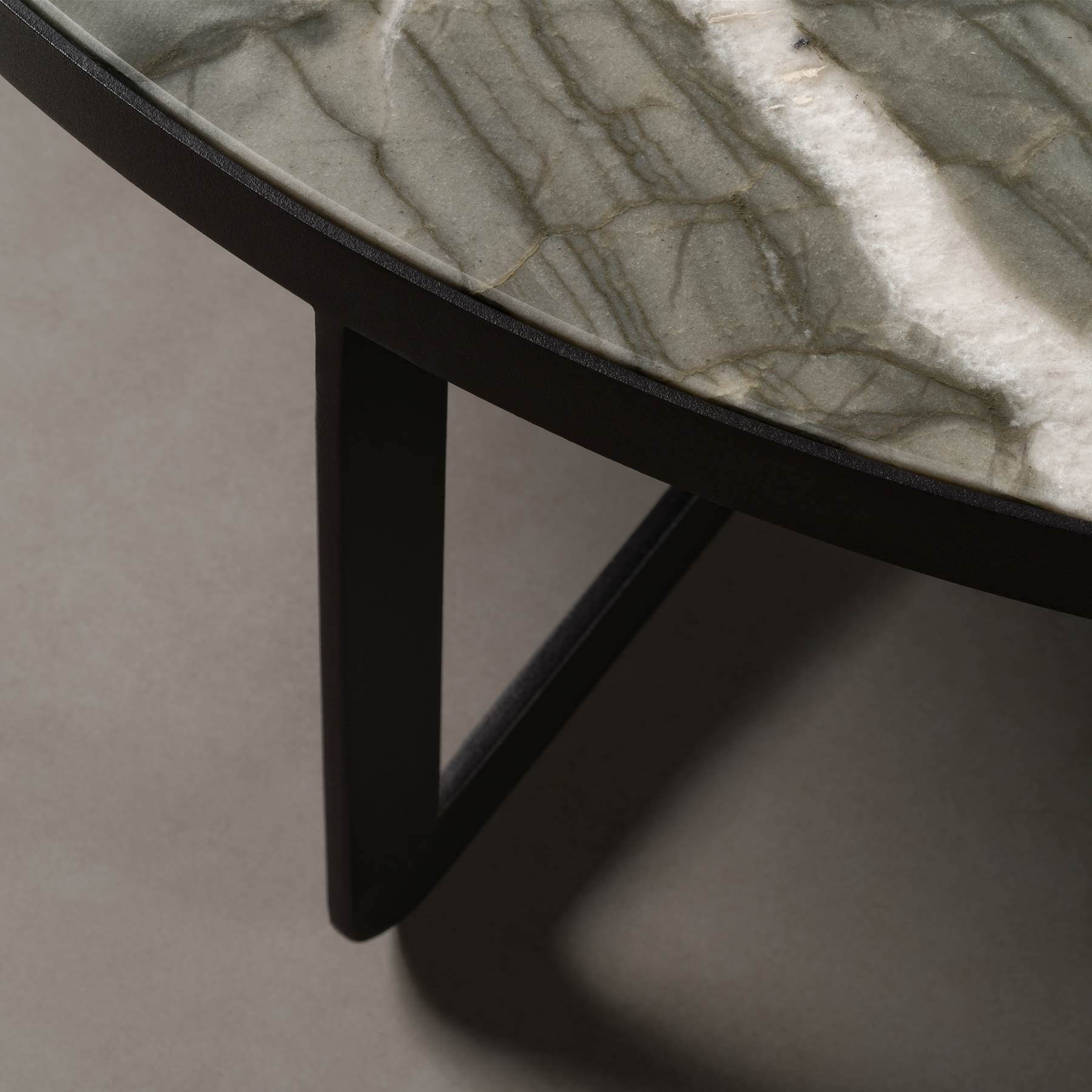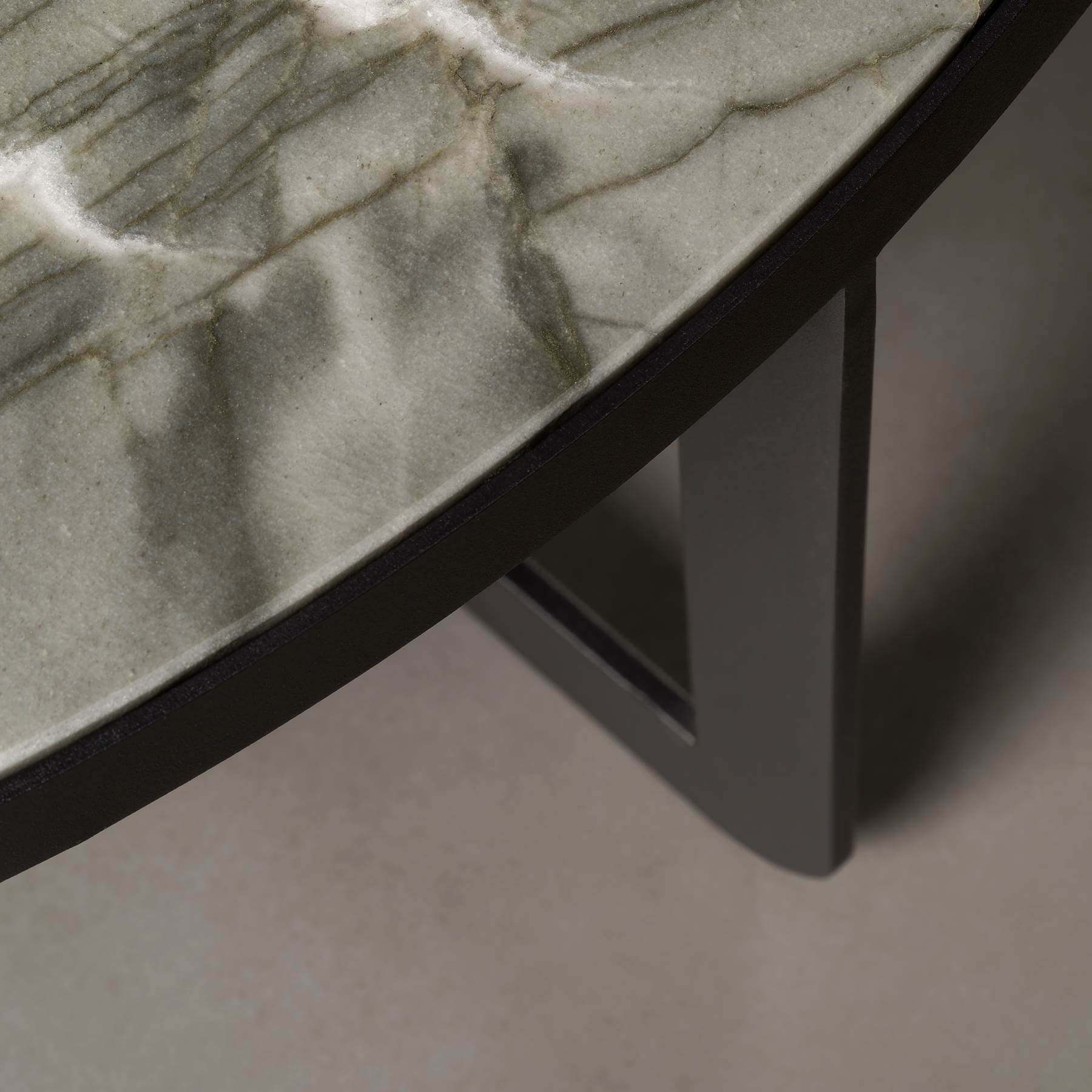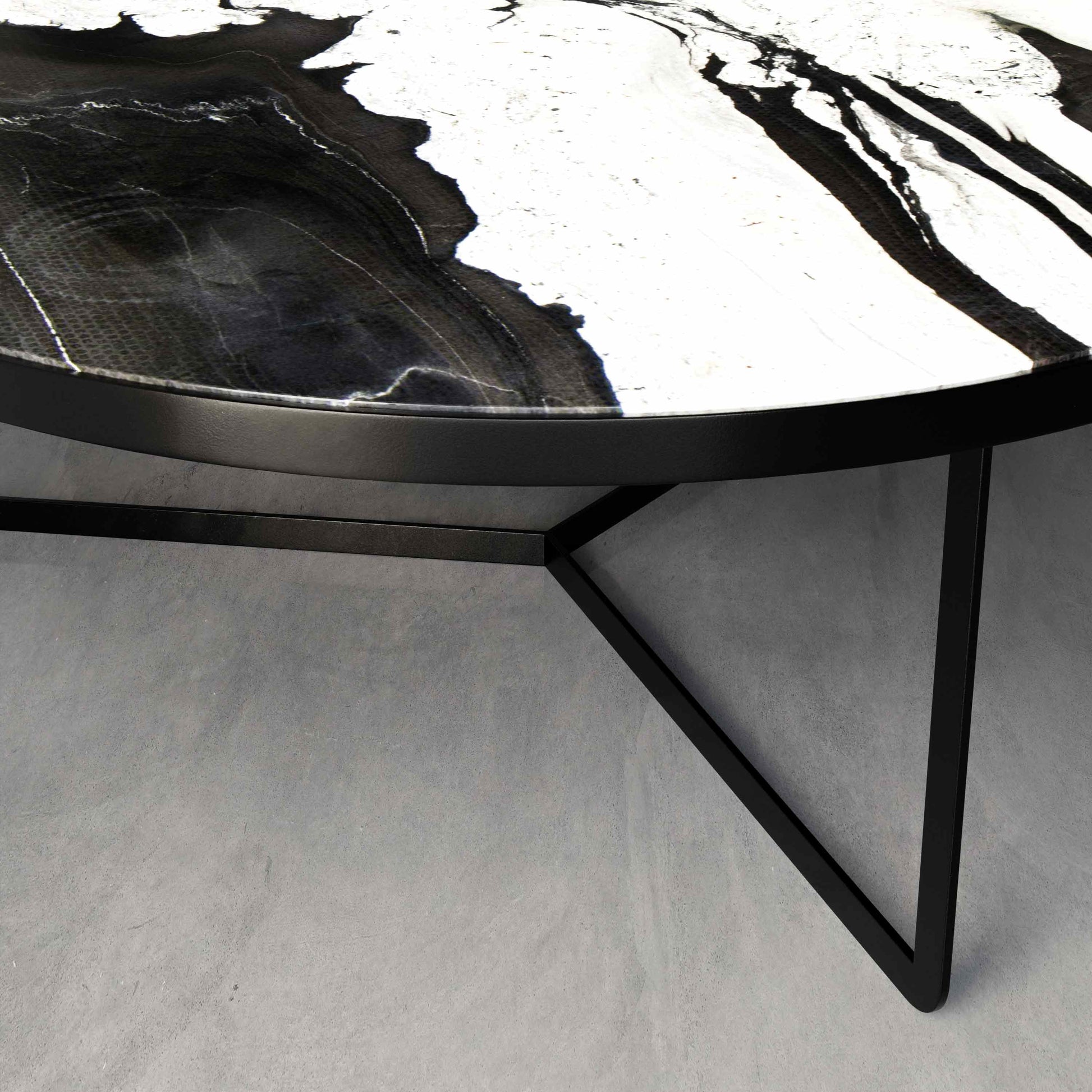 Unser Modell "Osaka" ist ein moderner und futuristischer Couchtisch. Der runde Couchtisch mit mattschwarzem Gestell, das überwiegend aus recyceltem Metall hergestellt wurde, und einem echten Naturstein Ihrer Wahl kann der neue Blickfang in jedem Raum werden.