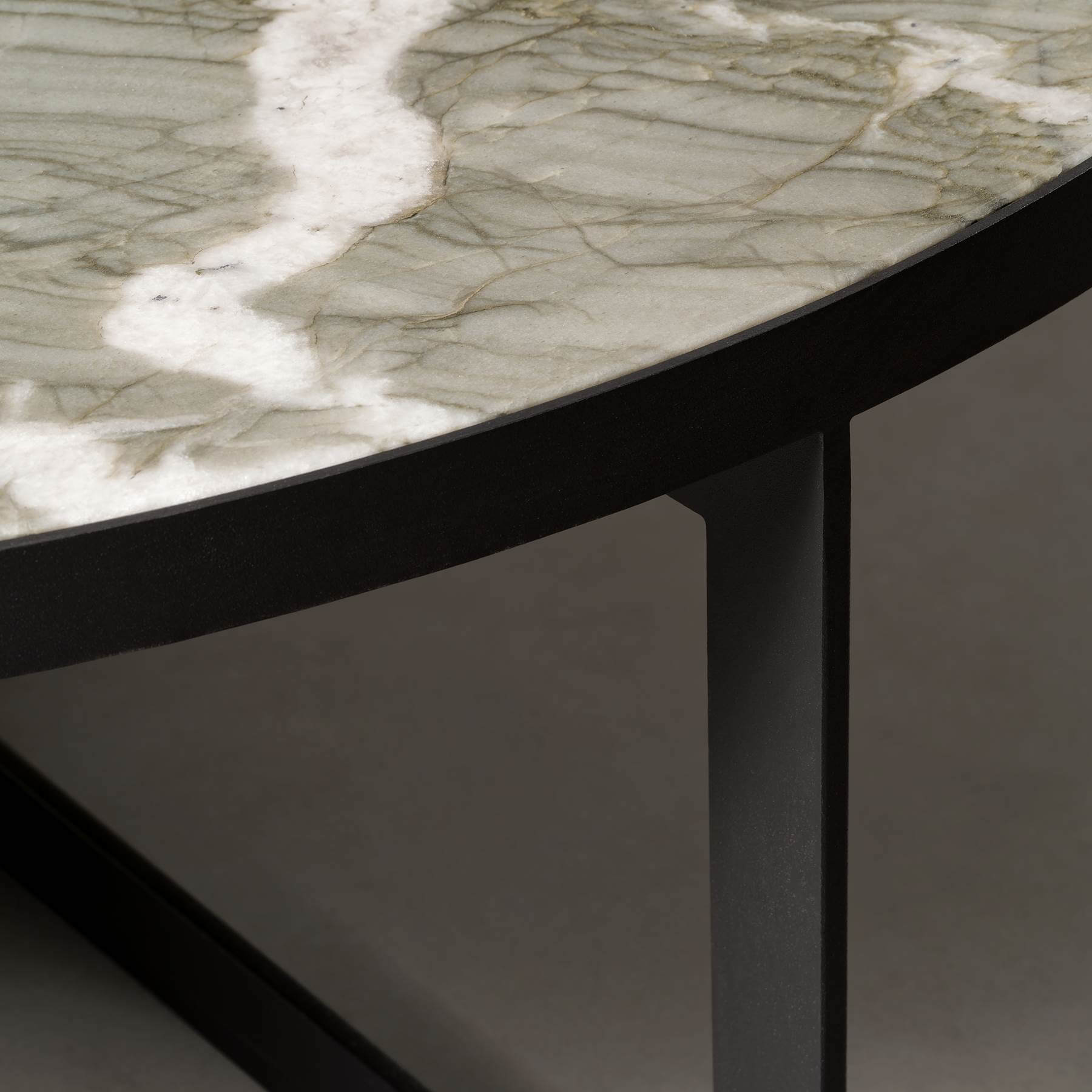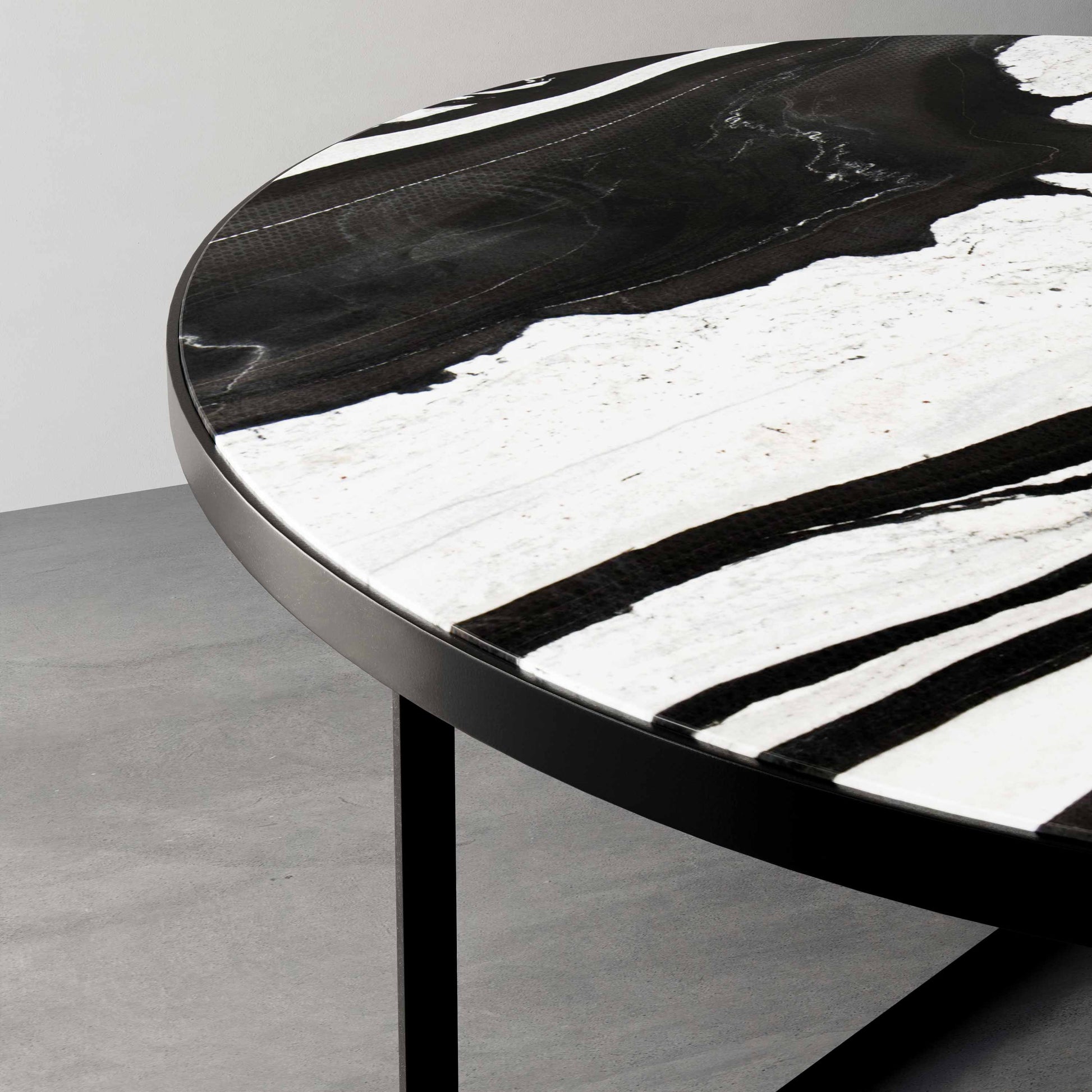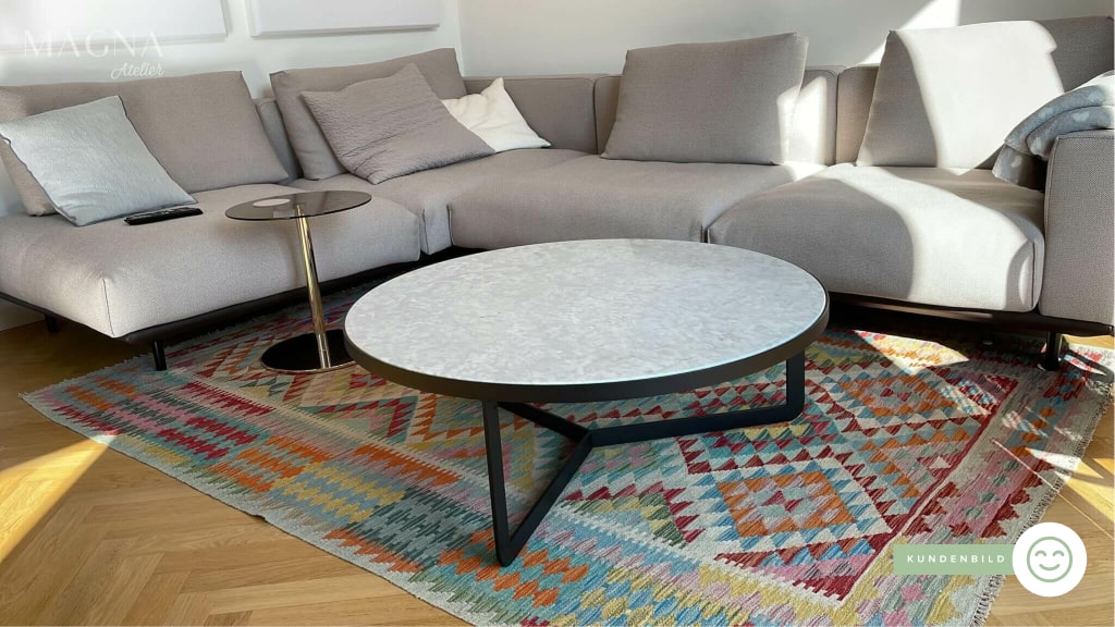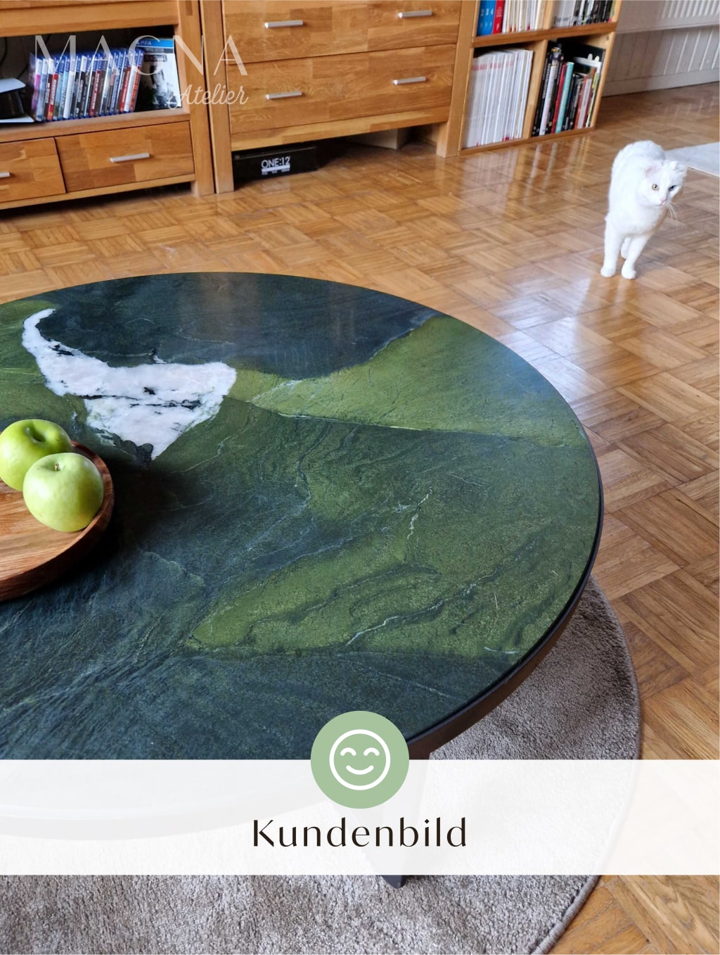 Unser Modell "Osaka" ist ein moderner und futuristischer Couchtisch. Der runde Couchtisch mit mattschwarzem Gestell, das überwiegend aus recyceltem Metall hergestellt wurde, und einem echten Naturstein Ihrer Wahl kann der neue Blickfang in jedem Raum werden.
