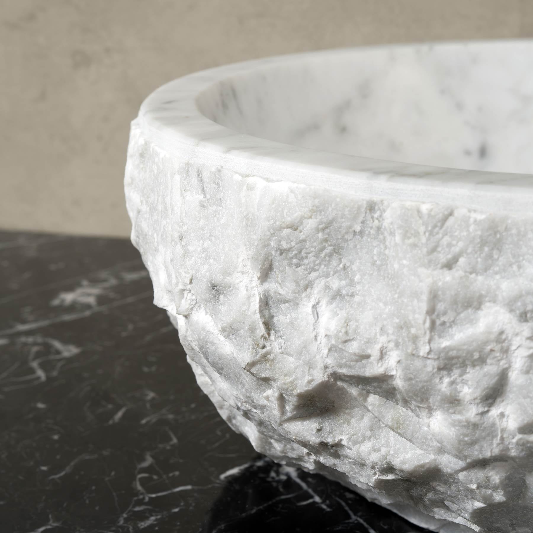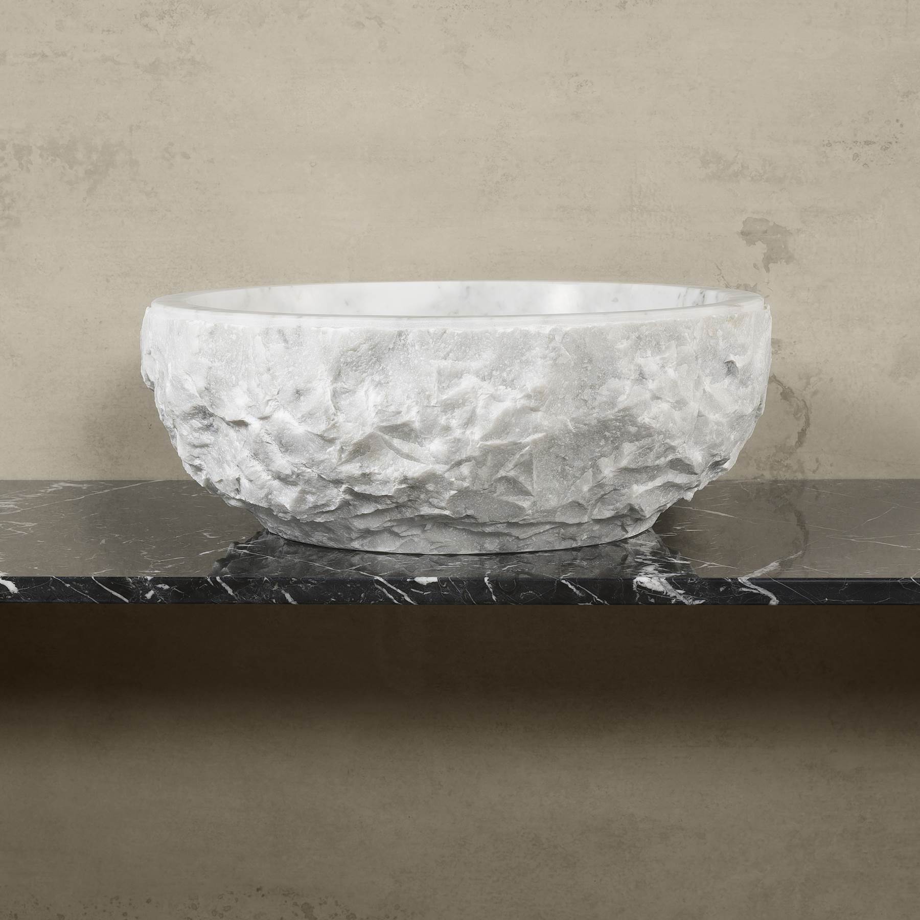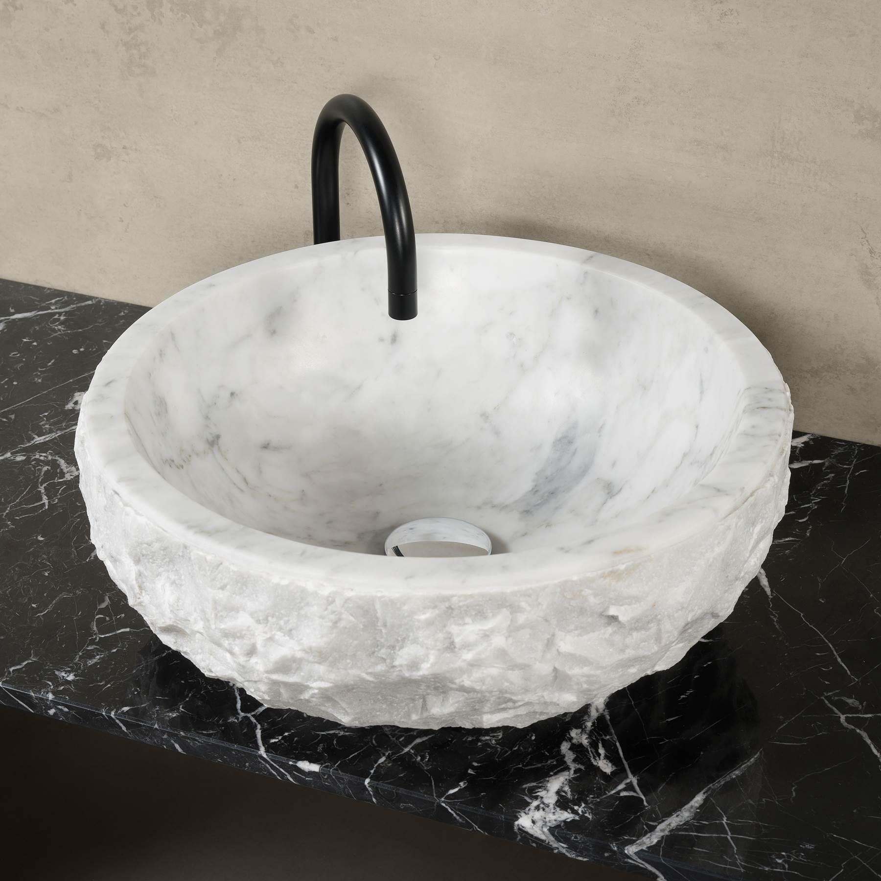 Unser Modell "Saturnia" ist ein ganz besonderer Hingucker für Ihr Badezimmer. Gemeißelt aus dem bekannten Naturstein Bianco Carrara eignet es sich nicht nur exzellent für den Nassbereich, sondern verleiht dem ganzen Raum ein besonderes Flair. Die Aussenseite wurde gekopft und geschlagen, wie man es von Statuen kennt. Eine besonders edle und seltene Verarbeitung für Waschbecken. Die Innenseite ist matt und das Waschbecken wurde vollständig imprägniert und ist durch das 4,5cm große Bohrloch auch direkt einsatzbereit.