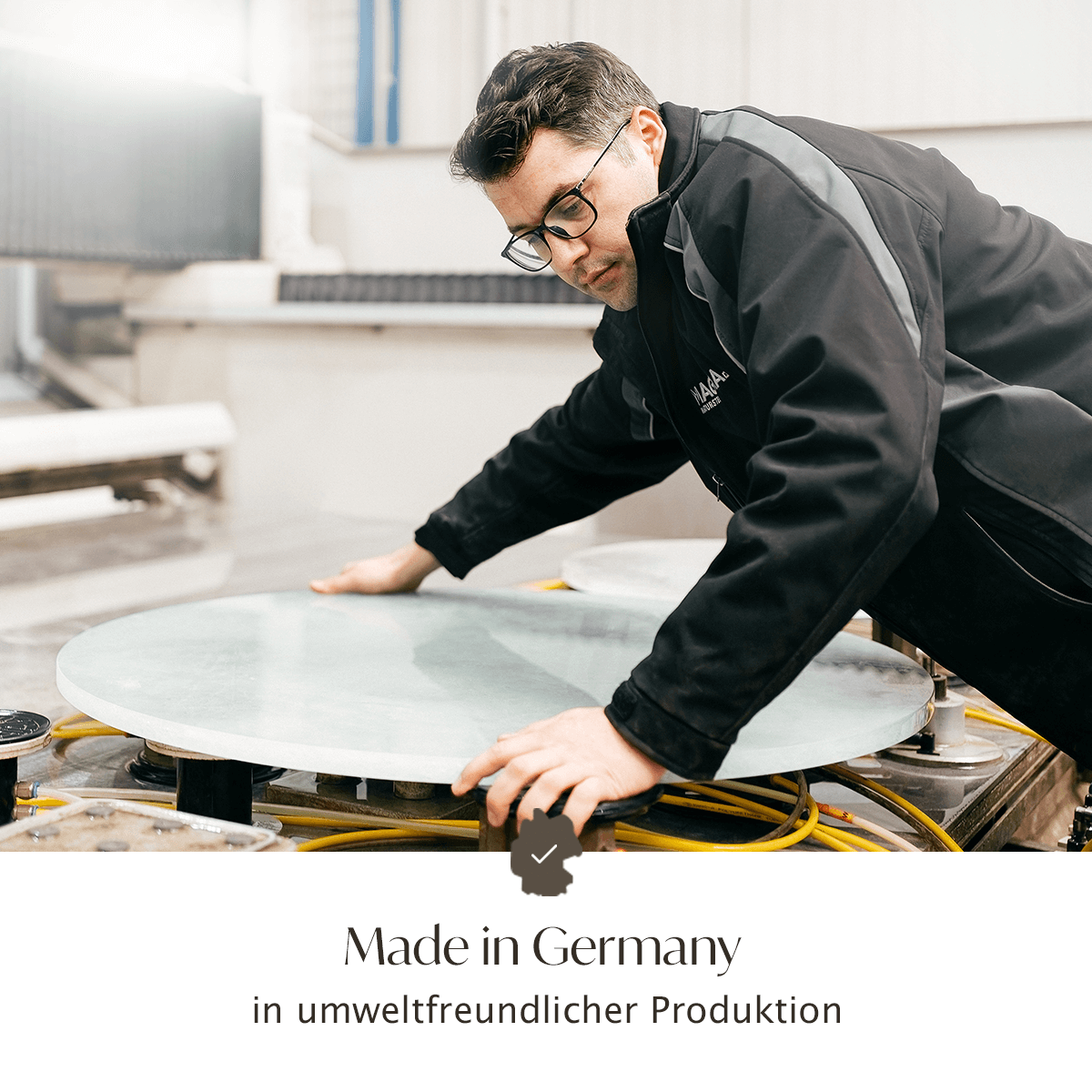Mit unserer Glaskeramik holen Sie sich ein echtes Unikat in Ihr Zuhause, da jede Glaskeramik eine unterschiedliche Schollen-Maserung hat, die sich aus dem Einschmelzen der Glasscherben ergibt. Konfigurieren Sie jetzt Ihr Einzelstück. Ihre Platte wird in unserer umweltfreundlichen Produktion in Loitsche (Sachsen-Anhalt) speziell für Sie hergestellt.